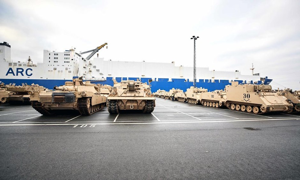 Am Wochenende kam das erste Transportschiff im norddeutschen Bremerhaven an. Panzer, Fahrzeuge, Material und 4.000 Soldaten der 3. Gepanzerten Kampfbrigade der 4. Infantrie-Division in Fort Carson (US-Bundesstaat Colorado) werden zunächst nach Polen verlegt.