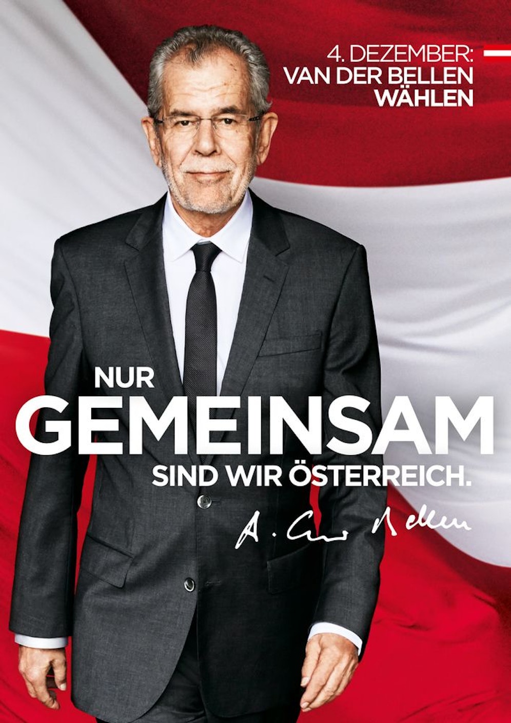 "Nein zum Öxit. Gemeinsam stärker". "Nur gemeinsam sind wir Österreich". Mit staatstrangenden Plakaten ging Präsidentschaftskandidat Alexander Van der Bellen am Montag in die heiße Phase des Wahlkampfs.
