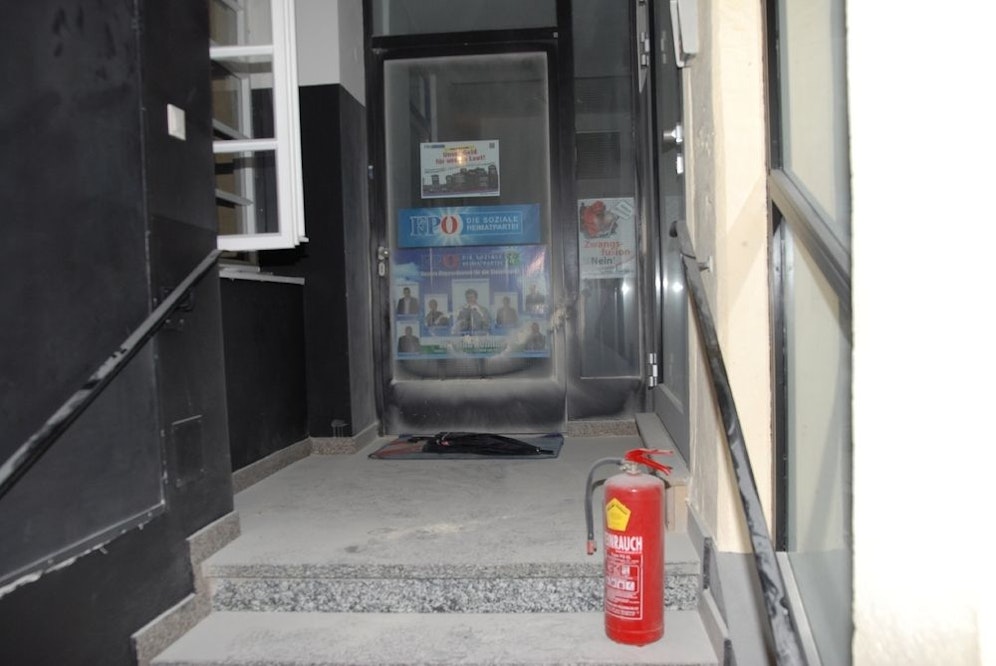 Um 22.45 Uhr wurde in dem Haus in der Hans-Sachs-Gasse in Graz der Feueralarm ausgelöst. Als die Einsatzkräfte bei der FPÖ-Zentrale eintrafen, bemerkten sie sofort, dass die Haustür aufgebrochen war. Die Fassade des Gebäudes war beschmiert, im Stiegenhaus herrschte Chaos.