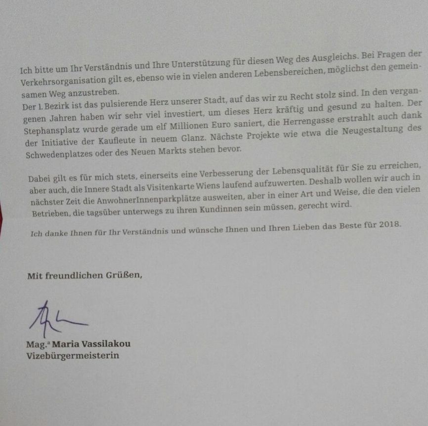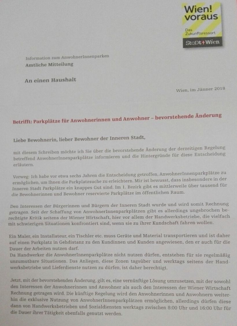 Interessant ist vor allem die Formulierung, man wolle mit dem Schreiben "über die bevorstehende Änderung der derzeitigen Regelung" betreffend Anwohnerparkplätze informieren.