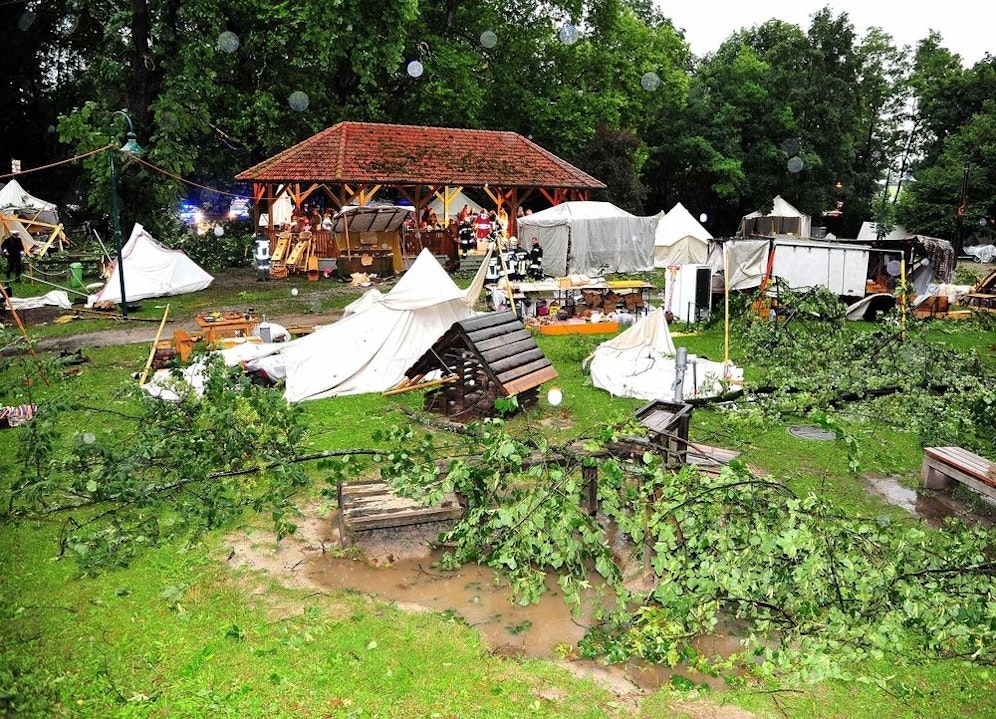 in Pöchlarn (NÖ) versetzte 400 Gäste in Panik. Ein Baum brach und traf Gerhard W. (50), der am Sonntag im Spital starb. Unter den Verletzten ist auch sein Sohn Lukas (7), der jetzt Vollwaise ist.