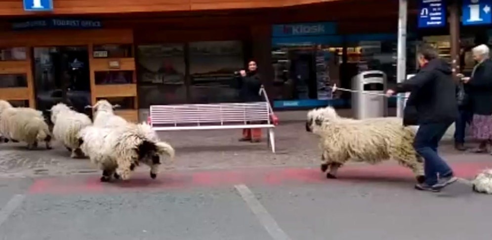Am Freitagnachmittag kam es auf dem Bahnhofplatz in Zermatt VS zu einem kleinen Spektakel. Beim Umzug von der Weide ins Winterquartier büxte eine Schafherde aus und trabte quer über den Platz. Ihr Ziel: eine Filiale der Drogerie-Kette "Müller".