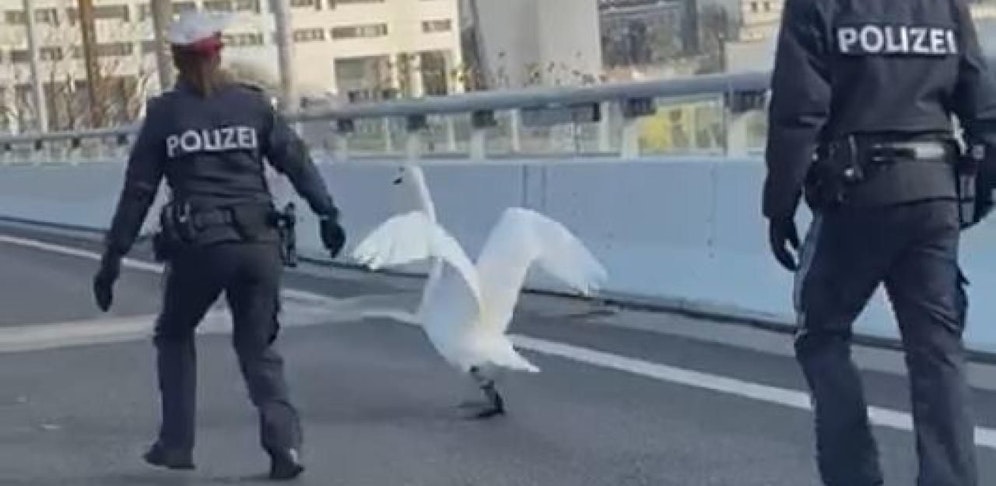 Ein "Heute"-Leser entdeckte am Samstagvormittag einen Schwan, der über die Reichsbrücke spazierte. Die Polizei konnte mit vollem Einsatz das Tier zum Wegfliegen bewegen.