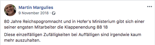 Grund für die Klage ist ein Facebook-Posting von Margulies, in dem er schrieb: "80 Jahre Reichsprogromnacht und in Hofer's Ministerium gibt sich einer seiner engsten Mitarbeiter die Klappenendung 88 18. Diese einzelfälligen Zufälligkeiten bei Auffälligen sind irgendwie kaum mehr auszuhalten".