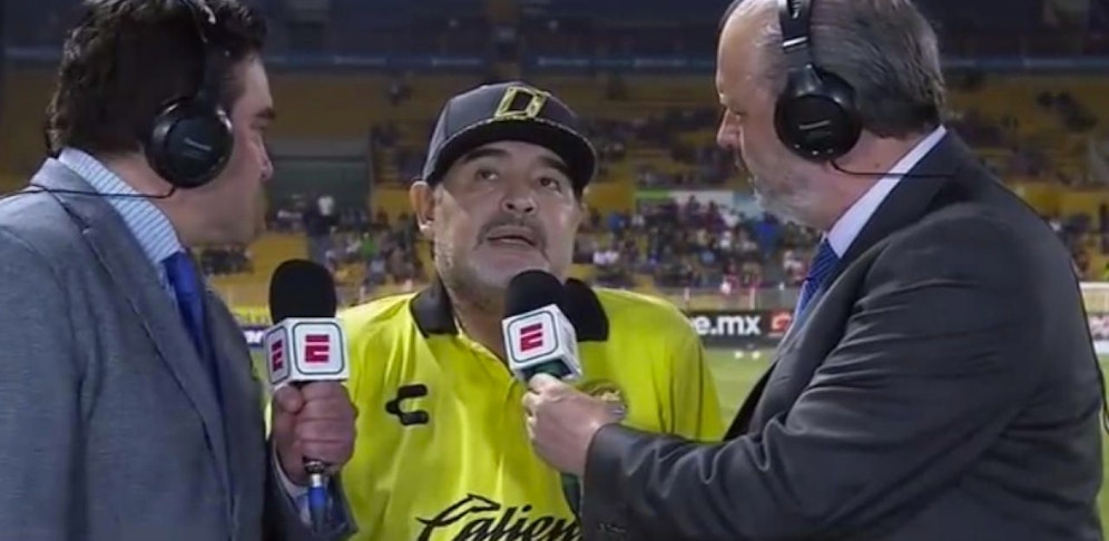 Im Anschließenden Interview verschlägt es dem Ex-Kicker jedoch die Sprache. "Da Sie nun in Mexiko aktiv sind, nehme ich an, dass Sie auch die erste Liga regelmäßig verfolgen. Wie bewerten Sie das Niveau in der mexikanischen MX League?", wird Maradona gefragt.