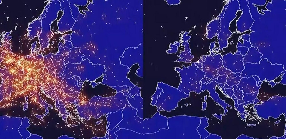 Ein Zeitraffervideo zeigt, wie sich die Corona-Beschränkungen auf den Flugverkehr am Himmel über Europa auswirkt. Der Vergleich mit 2019 ist erstaunlich.