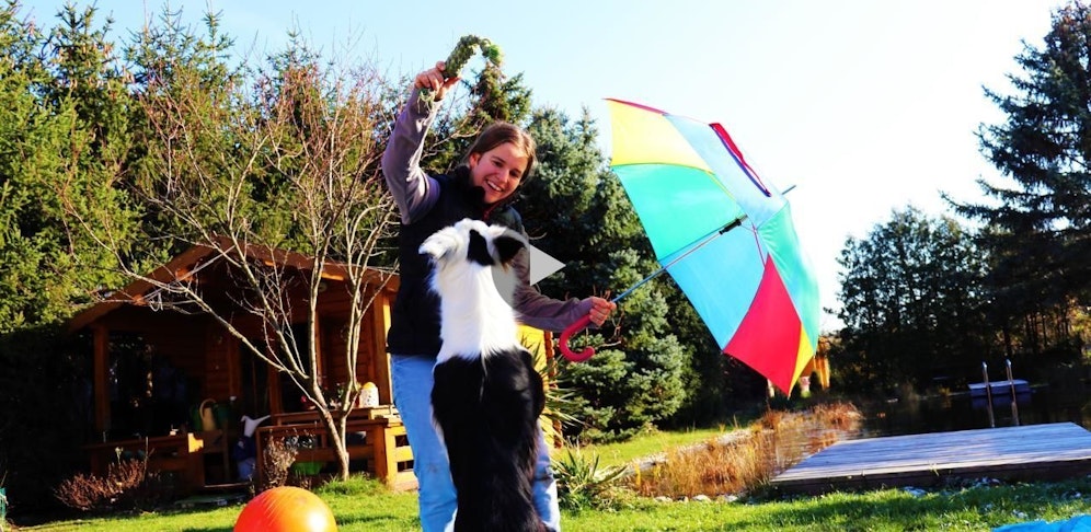 Wichtig: Achten Sie beim Training darauf, dass Ihr Hund nie in eine Paniksituation kommt. Wenn das schnelle Aufspannen des Regenschirms zu schwierig ist, fangen Sie damit an, den Schirm ganz langsam und möglichst geräuschlos aufzuspannen. Steigern Sie den Schwierigkeitsgrad langsam. Schließen Sie sicherheitshalber alle Türen und verwenden Sie ein Sicherheitsbrustgeschirr oder sichern Sie den Hund doppelt.