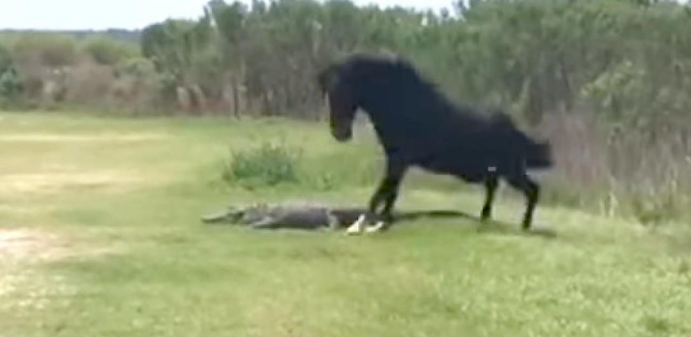 Zu sehen: Ein schwarzer Hengst legt sich mit einem Alligator an, trampelt auf das Reptil ein. Dieser fletscht seine messerscharfen Zähne, schnappt nach dem Angreifer – bekommt ihn aber nicht zu fassen und sucht schließlich eingeschüchtert das Weite.