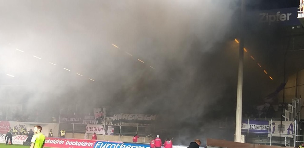 Beim Stand von 0:2 zündeten die Gäste-Anhänger in ihrem Block Feuerwerkskörper, warfen diese auf das Spielfeld. Wenige Augenblicke danach zündeten einige Chaoten auch noch Rauchbomben.