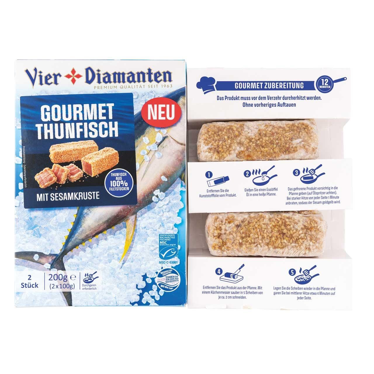 Ein "Gourmet Thunfisch mit Sesamkruste" der bekannten Thunfischmarke "Vier Diamanten" aus dem Tiefkühlregal wurde nun vom Verein für Konsumenteninformation VKI vor Gericht aufgetaut. Gar nicht munden wollte den Konsumentenschützern, die im Auftrag des Sozialministeriums agierten, nämlich die Verpackung des Feinschmecker-Gerichts.