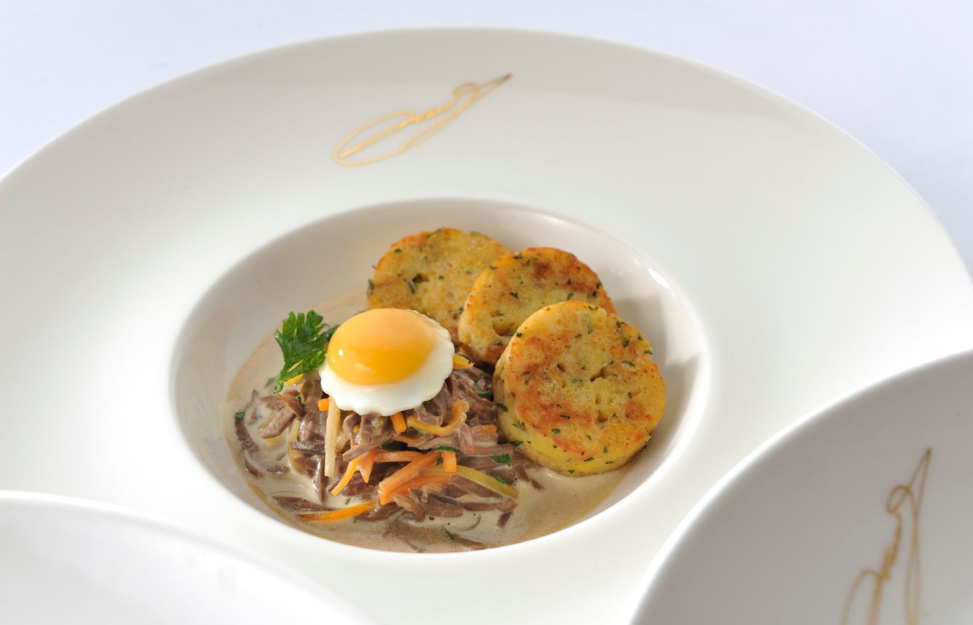 Toni Mörwald: Ja, das Rieslingsbeuscherl vom Kalb mit Briocheknöderl und Wachtelspiegelei.