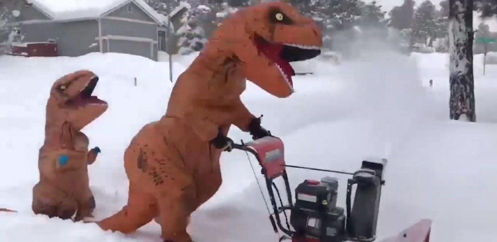Wenn Vater und Sohn gemeinsam zum Schneeschaufeln gehen und eine Menge Spaß dabei haben, kommt vielleicht so etwas dabei raus. Schon crazy, wenn sich zwei Dinosaurier im Schnee austoben...