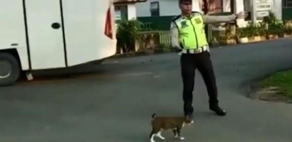 Diese Katze will eine stark befahrene Straße überqueren. Erstaunlicherweise befolgt sie dabei die Anweisungen des Verkehrspolizisten.