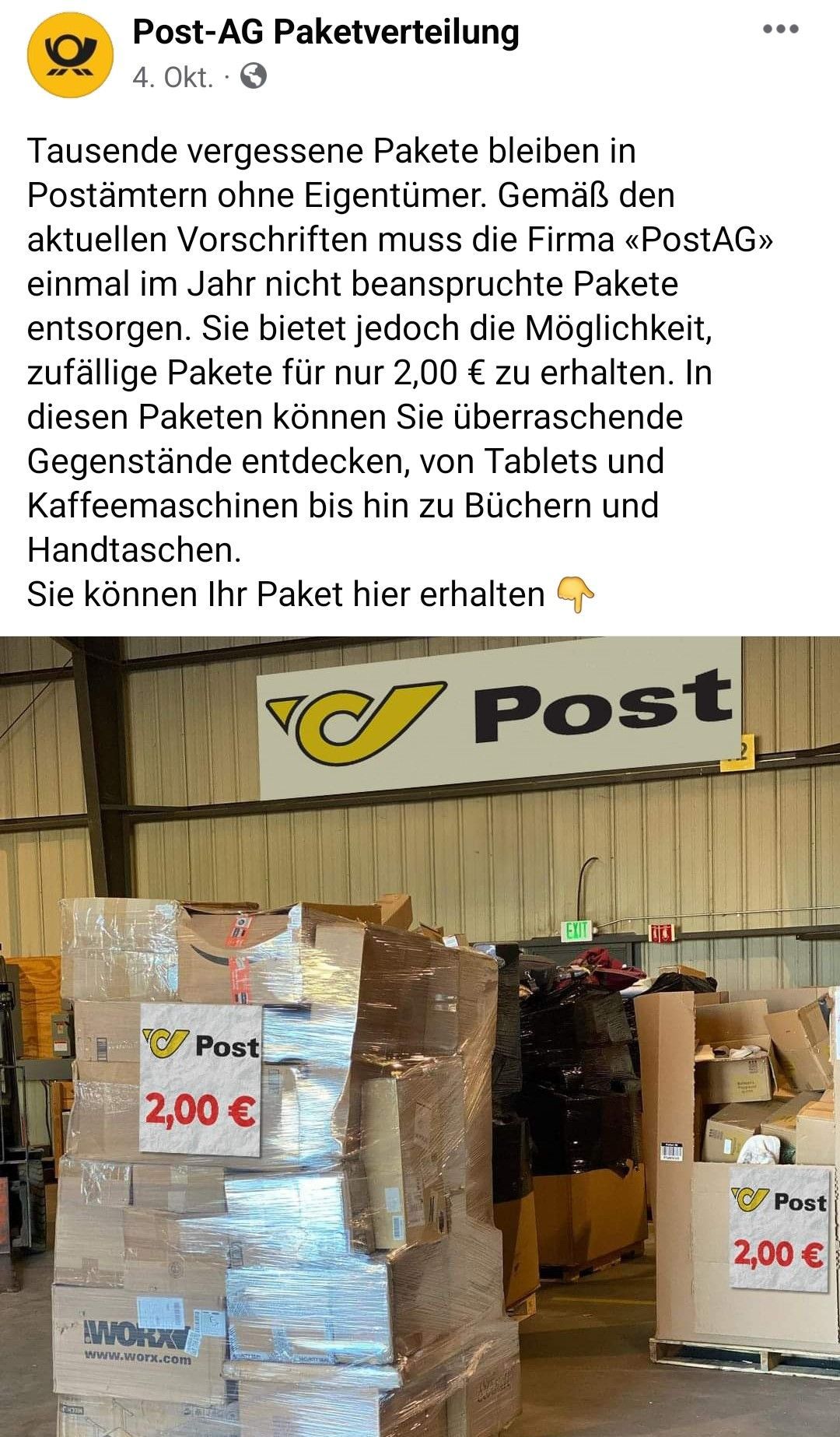 Das betrügerische Facebook-Profil "Post-AG Paketverteilung" behauptet demnach, tausende vergessene Pakete müssten wegen gesetzlicher Vorschriften von der Post AG entsorgt werden. Wer sich für einen Kauf entscheidet, tappt entweder durch die Eingabe und Überweisung des Geldbetrages in eine Abo-Falle oder die Kriminellen lösen Zahlungen aus und bringen Sie unter einem Vorwand zur Freigabe dieser Zahlung, warnt die unabhängige Internetfallen-Plattform "Watchlist Internet".