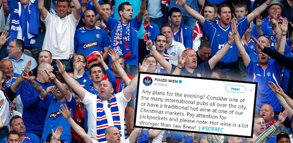 Damit sich diese nicht verloren fühlen oder gar auf dumme Gedanken kommen, werden sie von der Wiener Polizei mit jeder Menge Twitter-Meldungen in englischer Sprache versorgt. So werden die Fans vor Taschendieben auf Weihnachtsmärkten gewarnt. Auch beim Konsum von Glühwein sollen die vermeintlich trinkfesten Schotten aufpassen – schließlich weiß die Wiener Polizei, dass dieser viel mehr Alkoholgehalt als ein schottisches Bier aufweist. Jetzt wissen das auch die Rangers-Fans...
