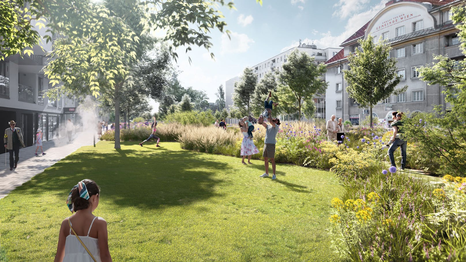 Insgesamt werden 8.100 Quadratmeter an Grünbereichen geschaffen und mehr als 80 Bäume und 80 Hochstammsträucher gepflanzt. Helle Pflasterung ermöglicht in Zukunft auf weiteren 8.700 Quadratmetern das Versickern von Niederschlagswasser. Ebenso geplant ist ein über 250 Meter langer "Straßenpark" zwischen Donauzentrum und Steigenteschgasse mit 37 neuen Bäumen und Sitzgelegenheiten. Platz gibt es, weil in diesem Abschnitt der Gleiskörper entfernt und die Nebenfahrbahn auf der stadteinwärtigen Seite aufgelassen wird.