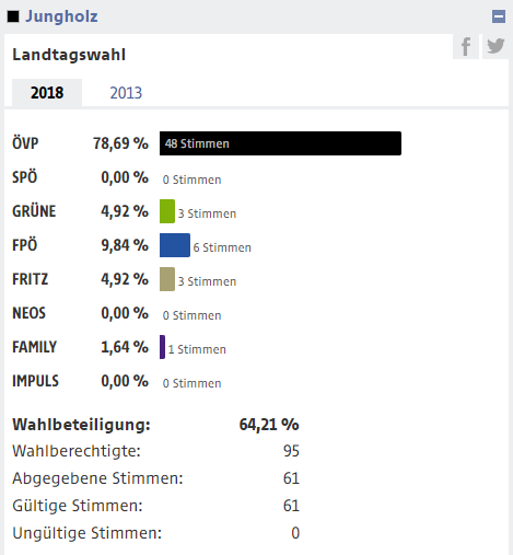 Der Grund dafür ist wohl, dass nur 95 Personen wahlberechtigt waren. Davon blieben 34 Stimmberechtigte zu Hause. Eine klare Mehrheit kreuzte das Feld neben der ÖVP an: 78,69 Prozent fielen auf die Platter-Partei. Sechs Jungholzer gaben ihre Stimmen der FPÖ, jeweils drei den Grünen und der Kleinpartei Fritz. Eine Person schenkte Family sein Kreuzchen.