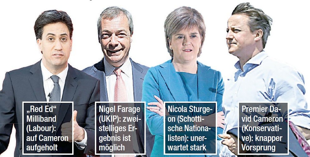 Die Wahl wird eine Zitterpartie für Premier (Konservative) und seinen Herausforderer Ed Milliband (Labour)! Laut Umfragen liegt Cameron nur noch knapp vorne. Doch die Briten stimmen am Donnerstag nicht nur über ihr Parlament ab, sondern auch über den EU-Kurs ihres Landes. Die EU-feindliche UKIP liegt schon bei 14 Prozent, hat mit ihrem Anti-Brüssel-Kurs vor allem Premier Cameron vor sich hergetrieben.