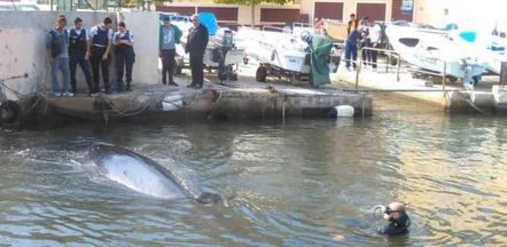 Nach Angaben der Behörden hatte der Wal zur Mittagszeit den Eingang zum alten Hafen blockiert.