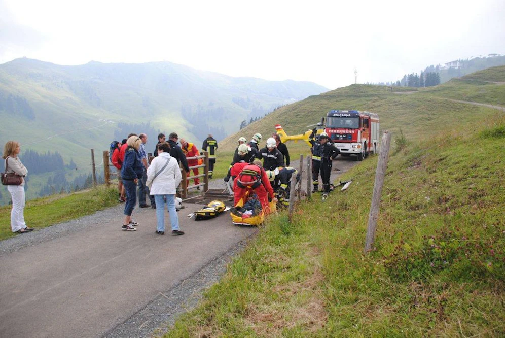 Bei seiner Wanderun ging der Mann südlich des Hauses Hahnenkamm 9 über den dortigen Weiderost. Dabei rutschte er mit dem Turnschuh aus und klemmte sich zwischen den Eisentraversen des Weiderostes ein und konnte sich nicht mehr selbst befreien. Die verständigte Feuerwehr Kitzbühel rückte mit 3 Fahrzeugen und 15 Mann zum Einsatzort aus. Weiters flog der Rettungshubschrauber C4 zur Unfallstelle.