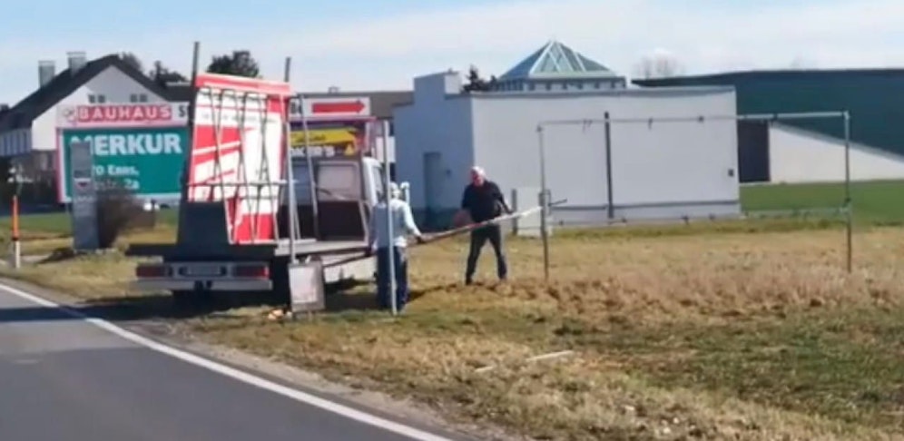 Per Aussendung machte die SPÖ auf ihr Facebook-Video aufmerksam. Und das zeigt: Zwei ÖVP-Funktionäre, die gerade dabei sind, bei Kristein in Enns, an der Grenze zu Asten, eines ihrer Werbe-Plakate abzumontieren.