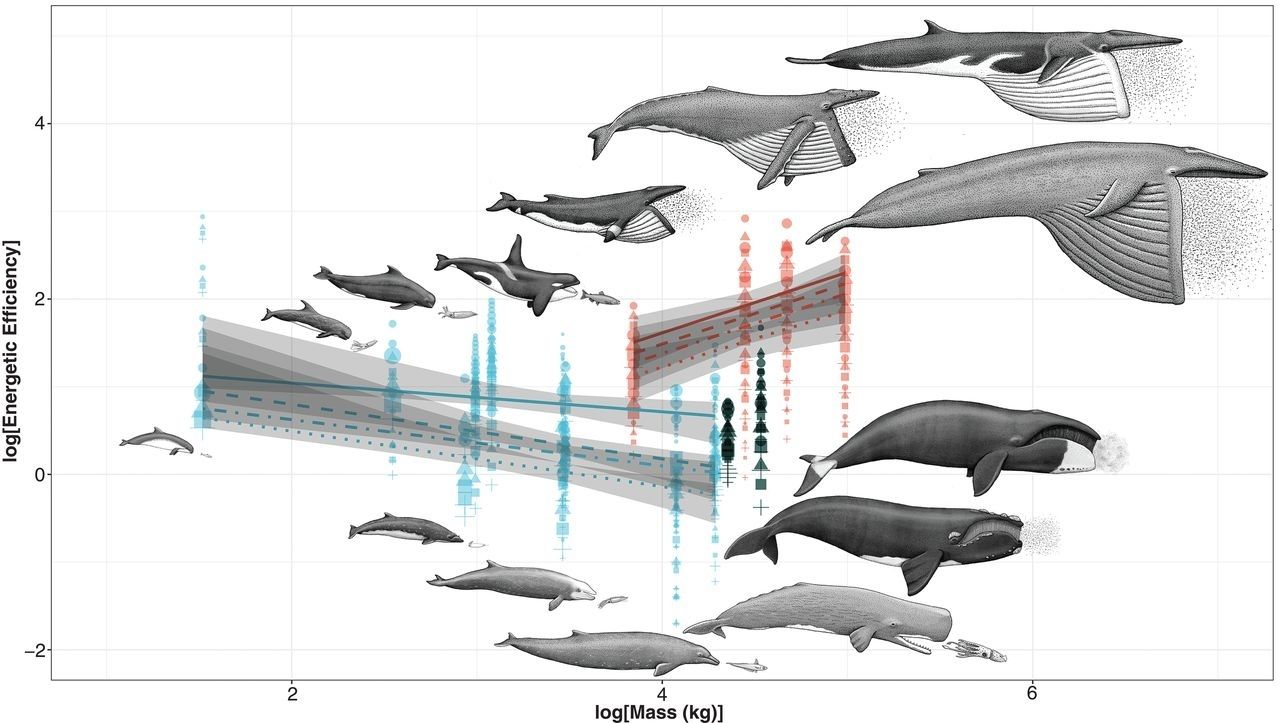 Dabei zeigt sich, dass genau diese der ausschlaggebende Faktor für die gedeckelte Größe bei den Zahnwalen ist. Diese sind konventionelle Raubtiere, die sich immer nur von einer Beute gleichzeitig ernähren. Die Messungen der Wissenschaftler zeigen, die Energieeffizienz der Jäger nimmt mit ihrer Größe ab.