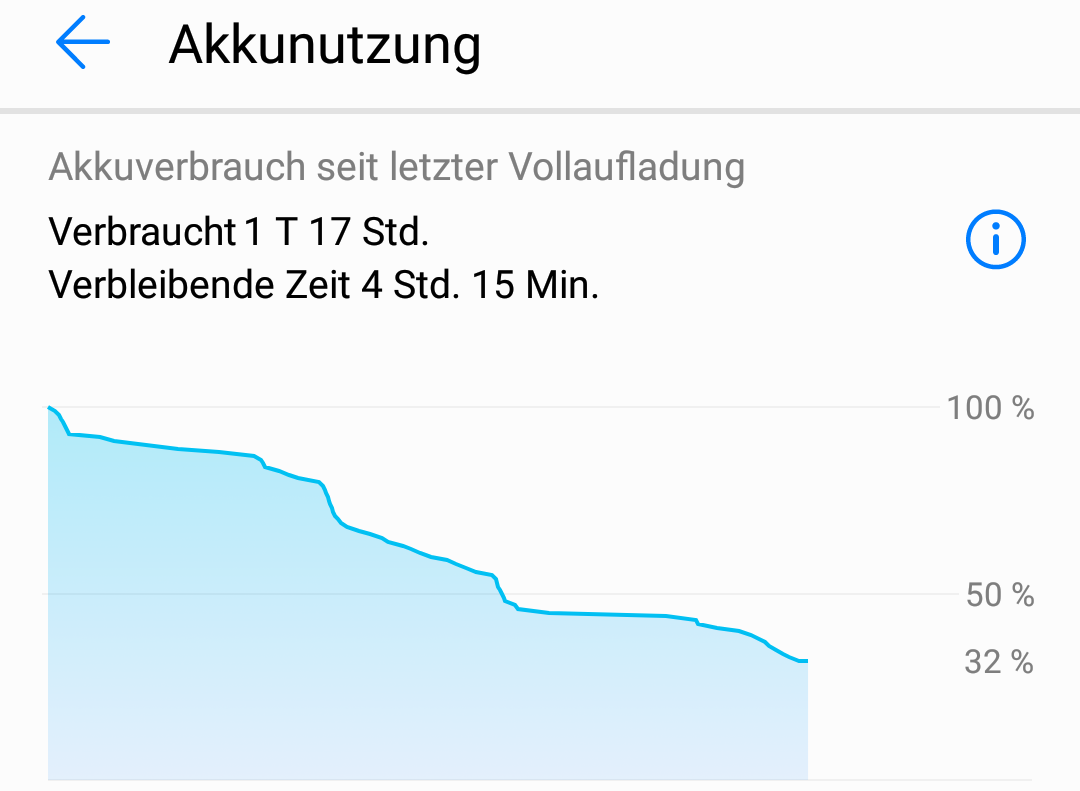 "Heavy User": Unser Redakteur hatte trotz fast durchgehender Nutzung auch nach einem Tag und 17 Stunden noch einen Batteriestand von 32 Prozent. Über vier Stunden hätte das Mate 10 pro noch Strom gehabt. (Bild: Rene Findenig)