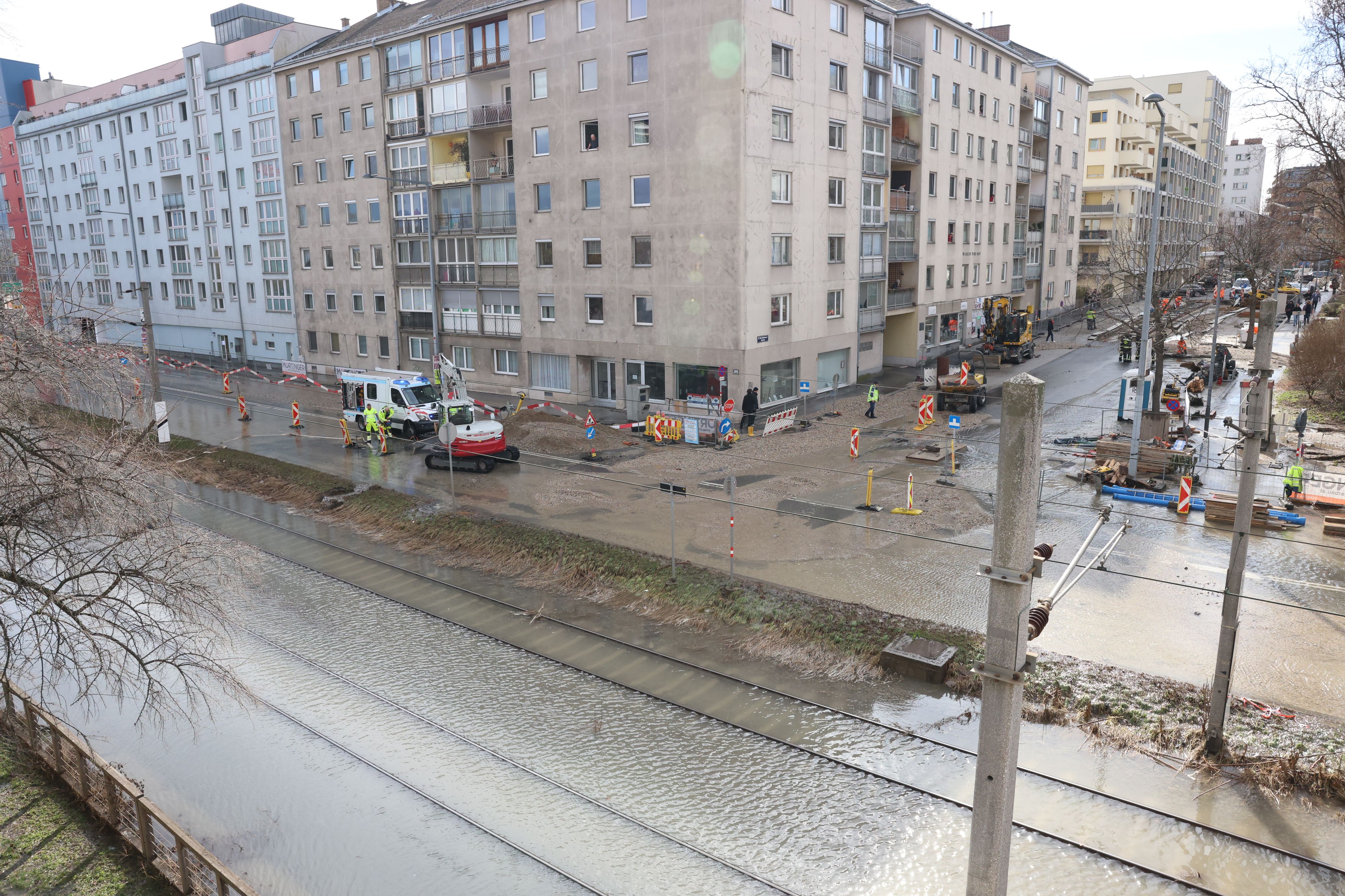 "In der Folge kam es in der Dr.-Natterer-Gasse zu einem Wasseraustritt, der sich bis zum Handelskai ausgebreitet hat", so die MA 31. Die Wassermassen drangen mit enormem Druck aus dem beschädigten Rohr. Dabei wurde auch Schmutz aus dem Untergrund an die Oberfläche gespült.