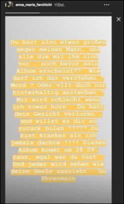 Am Montag postete Bushidos Ehefrau Anna-Maria eine Insta-Story, bei der einem die Haare zu Berge stehen. "Du hast also etwas großes gegen meinen Mann, und alle die mit ihm sind vor..." [sic!], klagt die 36-jährige Mutter der gemeinsamen Tochter. "Wie darf ich das verstehen? Mord? Oder vielleicht doch nur hinterhältig anstechen?" (seihe Screenshot des Postings rechts).