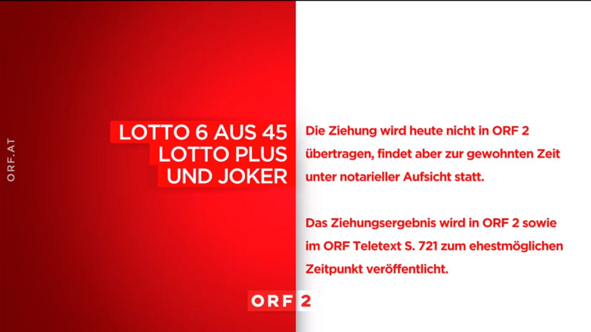 Alles ist möglich, speziell in bewegten Zeiten wie diesen. ORF-Seher wunderten sich Mittwochabend über den Entfall der Lottoziehung. Per Insert wurde das Publikum kurzerhand darüber in Kenntnis gesetzt, dass "die Ziehung heute nicht in ORF 2 übertragen wird, aber zur gewohnten Zeit unter notarieller Aufsicht" stattfinde.
