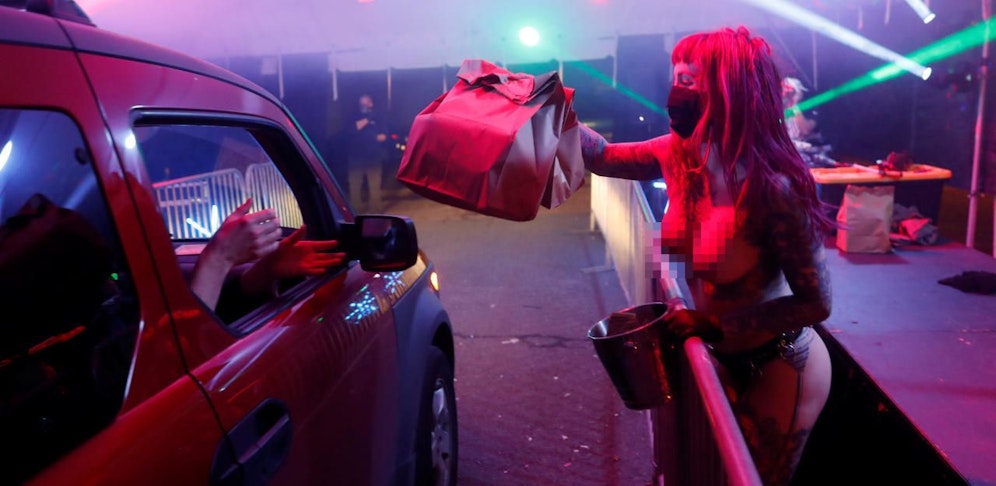 Um seinen Stripclub Lucky Devil Lounge in Portland im US-Bundesstaat Oregon während der Corona-Krise nicht schließen zu müssen, hat sich Besitzer Shon Boulden etwas einfallen lassen. Er wandelte seinen Betrieb in einen Drive-Through-Stripclub um, indem er ein befahrbares Zelt auf den Parkplatz des Clubs stellte und das Angebot um einen Take-away-Service erweiterte. Der Grund: Drive-Through-Restaurants sind trotz Corona weiterhin erlaubt.