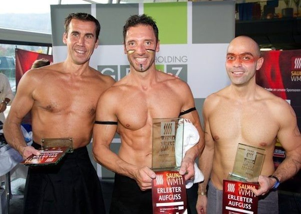 An die Handtücher, auf die Saunaplätze, und... Hitze: 35 Kanditaten aus aller Welt nehmen an der vierten Sauna -"Aufguss"-WM teil. Der Austragungsort ist "Auster"-Sport- und Wellnessbad in Graz, Steiermark.