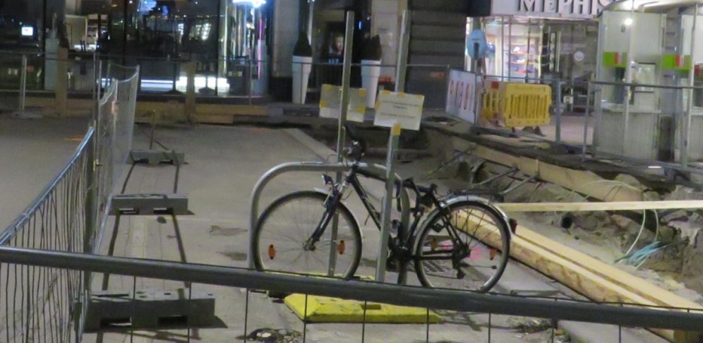 Einen Radfahrer dürfte die Sperre kalt erwischt haben: Sein Drahtesel steht jetzt mitten in der Baustelle, alle Abstellbügel bis auf einen wurden entfernt. Ein Schild weißt hin: "Diese Fahrradabstellanlage wird aufgelassen! Bitte entfernen Sie ihr Fahrrad."