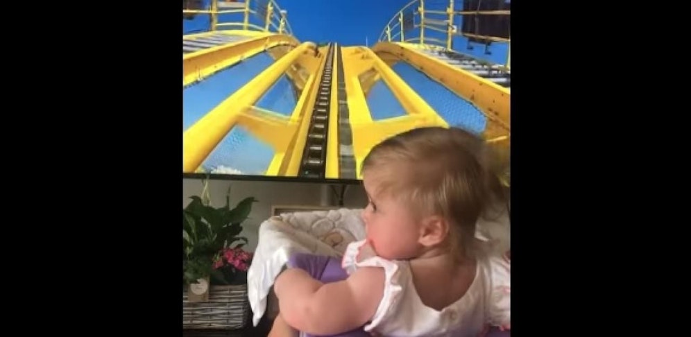 Der Mann setzte seine 6,5 Monate alte Tochter in ein gepolstertes Kästchen und vor einen Fernseher. Dann spielte er ein Video von einer Achterbahnfahrt ab. Die kleine Holly saß im Kästchen und ihr Papa simulierte die ganze Fahrt - unglaublich was den Vätern immer einfällt! (mz)