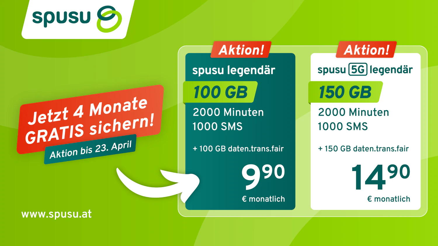 spusu trotzt dem Preiserhöhungs-Wahnsinn und startet mit neuen Angeboten: Bis 23. April gibt es den spusu legendär mit 100 GB Datenvolumen, 2.000 Minuten und 1.000 SMS um 9,90 Euro pro Monat.