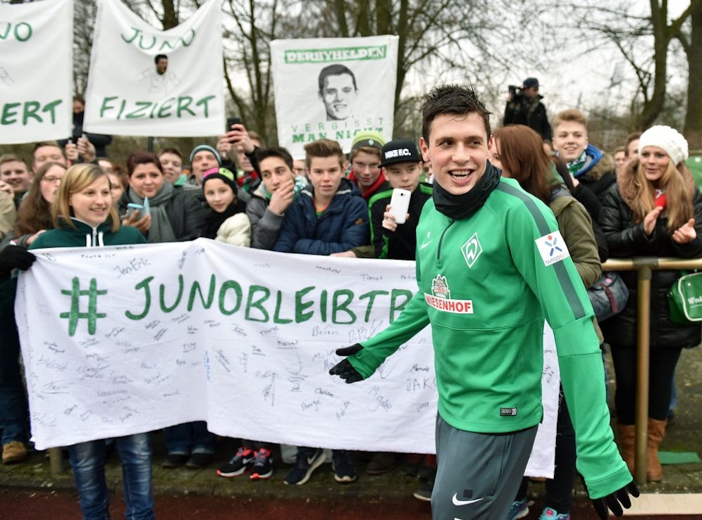 Der Mittelfeldspieler, der zuletzt mehrfach mit traumhaften Freistoßtoren aufgefallen ist, hat sich auf die Wunschliste zahlreicher Vereine gespielt. Unter anderem wollen ihn Borussia Mönchengladbach, der HSV, Hannover 96 und Trabzonspor verpflichten. Den Bremer Fans ist der quirrlige Kärntner schon sehr ans Herz gewachsen. Immer wieder tauchen Werder-Anhänger mit Transparenten beim Training auf. In den sozialen Netzwerken findet man unter dem Hashtag #junobleibtbremer immer die neuesten Infos zur aktuellen Lage der Verhandlungen.