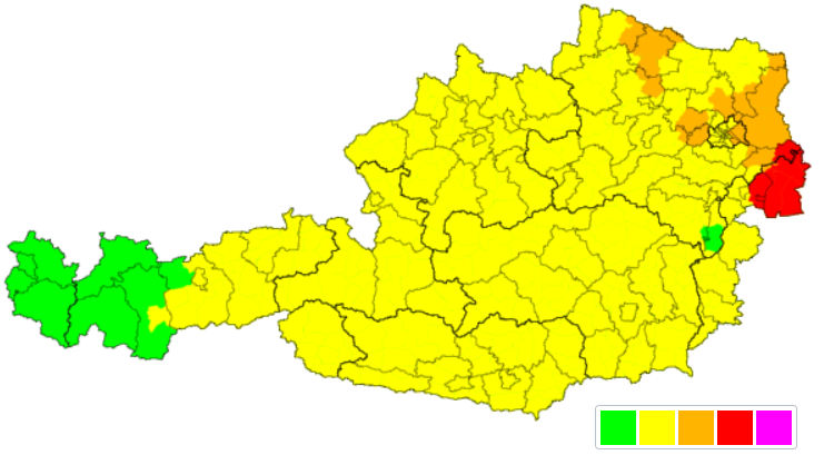 Unwettergefahr besteht im Osten des Landes, laut Unwetterzentrale (UWZ) gilt für Teile Niederösterreichs und des Burgenlands Alarmstufe rot.