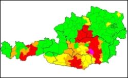 In der Steiermark sind fast alle Bezirke betroffen: Liezen, Murau, Murtal, Leoben, Bruck-Mürzzuschlag, Weiz, Graz-Umgebung, Voitsberg, Hartberg-Fürstenfeld und die Südoststeiermark. Über weite Bereiche gilt Warnstufe Rot, in Graz-Umgebung, Weiz, Bruck-Mürzzuschlag und Voitsberg Warnstufe Violett.