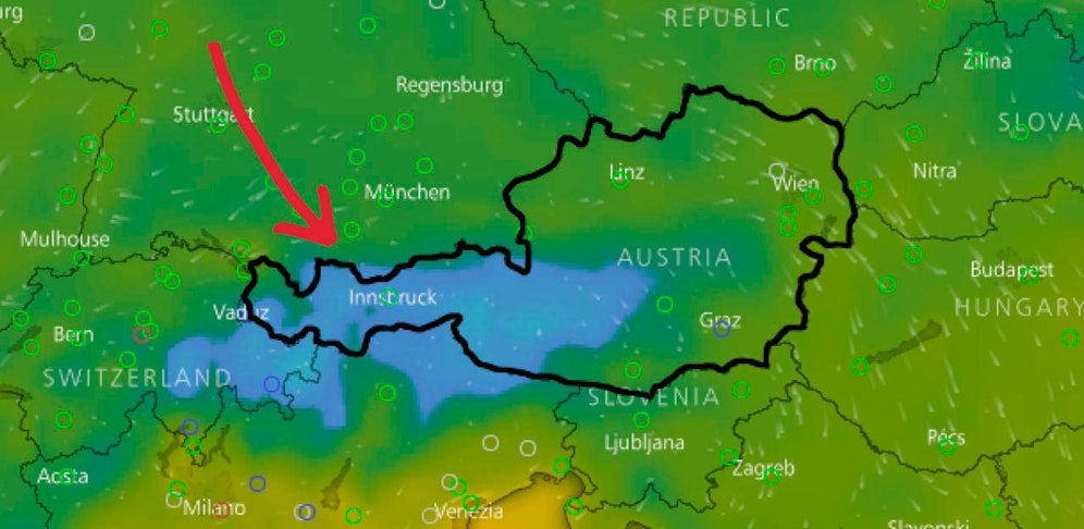 "Die Kaltfront erwischt uns nur in bodennahen Schichten mit voller Wucht, das beideutet, dass die Höhenkaltluft etwas nördlich der Alpen liegenbleibt. Somit kühlt es auf den Bergen nicht so stark ab und die Schneefallgrenze sinkt am Samstag auf nur rund 3000 m ab. Damit ist klar: Kein Schnee in den Städten!
