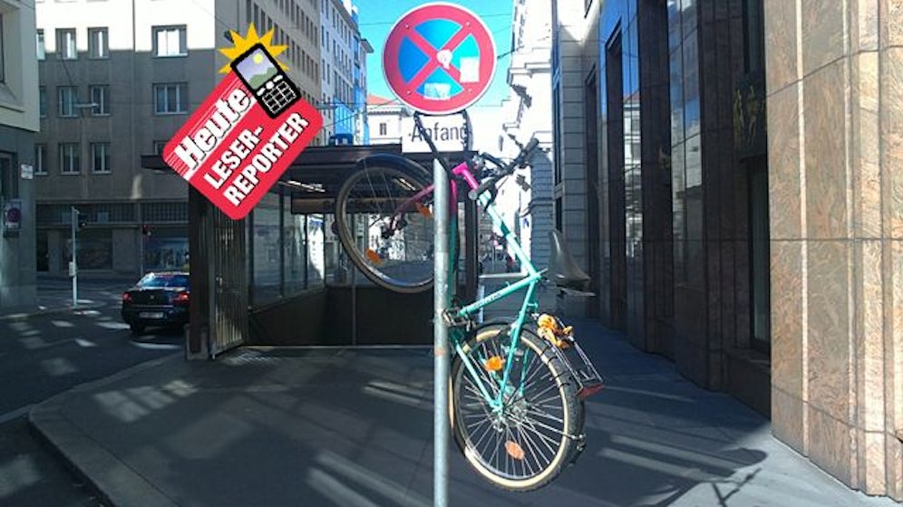 Unser Leserreporter hat dokumentiert, wie die heutige Parkplatzsituation für Fahrräder aussieht. Nicht rosig, wenn man dem Bild glauben schenken darf - denn der Besitzer des Bikes hat sogar auf ein "Parken und Halten Ende"-Verkehrsschild ausweichen müssen, um es befestigen zu können.