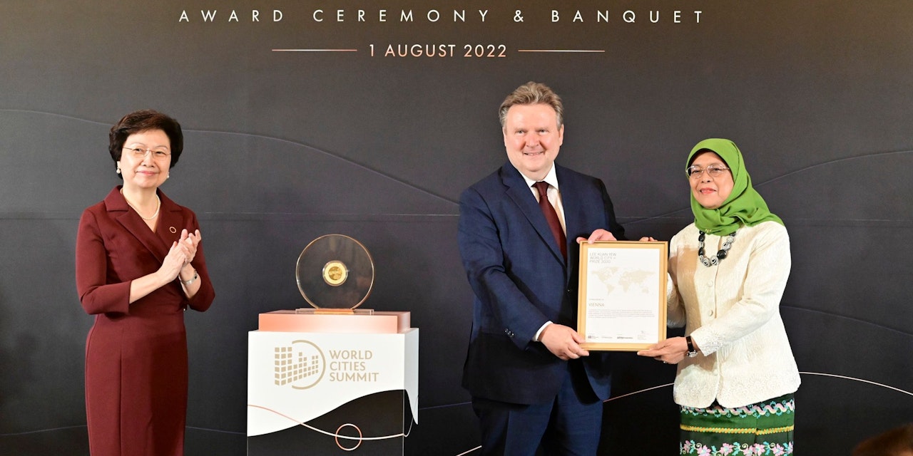 Im Rahmen der World Cities Summit 2022 in Singapur konnte Wien einen Preis abräumen: Der "Lee Kuan Yew World City Prize" würdigt alle zwei Jahre Leistungen und Beiträge zur Schaffung lebenswerter, lebendiger und nachhaltiger urbaner Gemeinschaften auf der ganzen Welt. Vergeben wurde der Preis an Wien schon 2020. Durch Corona konnte das Preisgeld von 200.000 Euro und eine Goldmedaille im Wert von mehr als 35.000 Euro erst jetzt an Bürgermeister Michael Ludwig (SPÖ) überreicht werden.