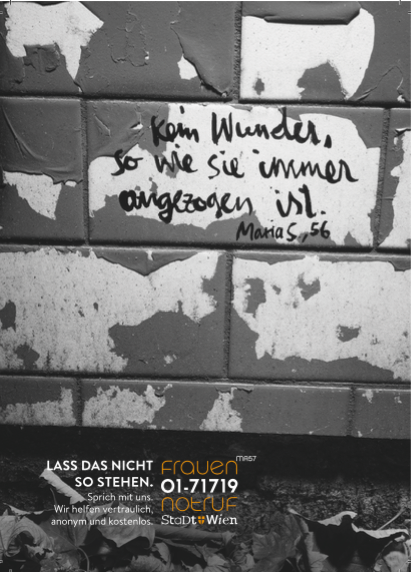 Ab 25. November setzen vier Kampagnensujets in Form von Postkarten und Plakate in Lokalen ein klares Zeichen gegen Gewalt. Mit Sätzen wie "Ein Nein einer Frau bedeutet eigentlich ein Ja" und "Kein Wunder, so wie sie immer angezogen ist" wird der Blick der Täter auf die von Gewalt betroffenen Frauen thematisieren. "Damit versuchen Täter den betroffenen Frauen die Schuld zuzuschieben. Sie müssen wissen: 'Nein heißt Nein'", stellt Gaal klar.