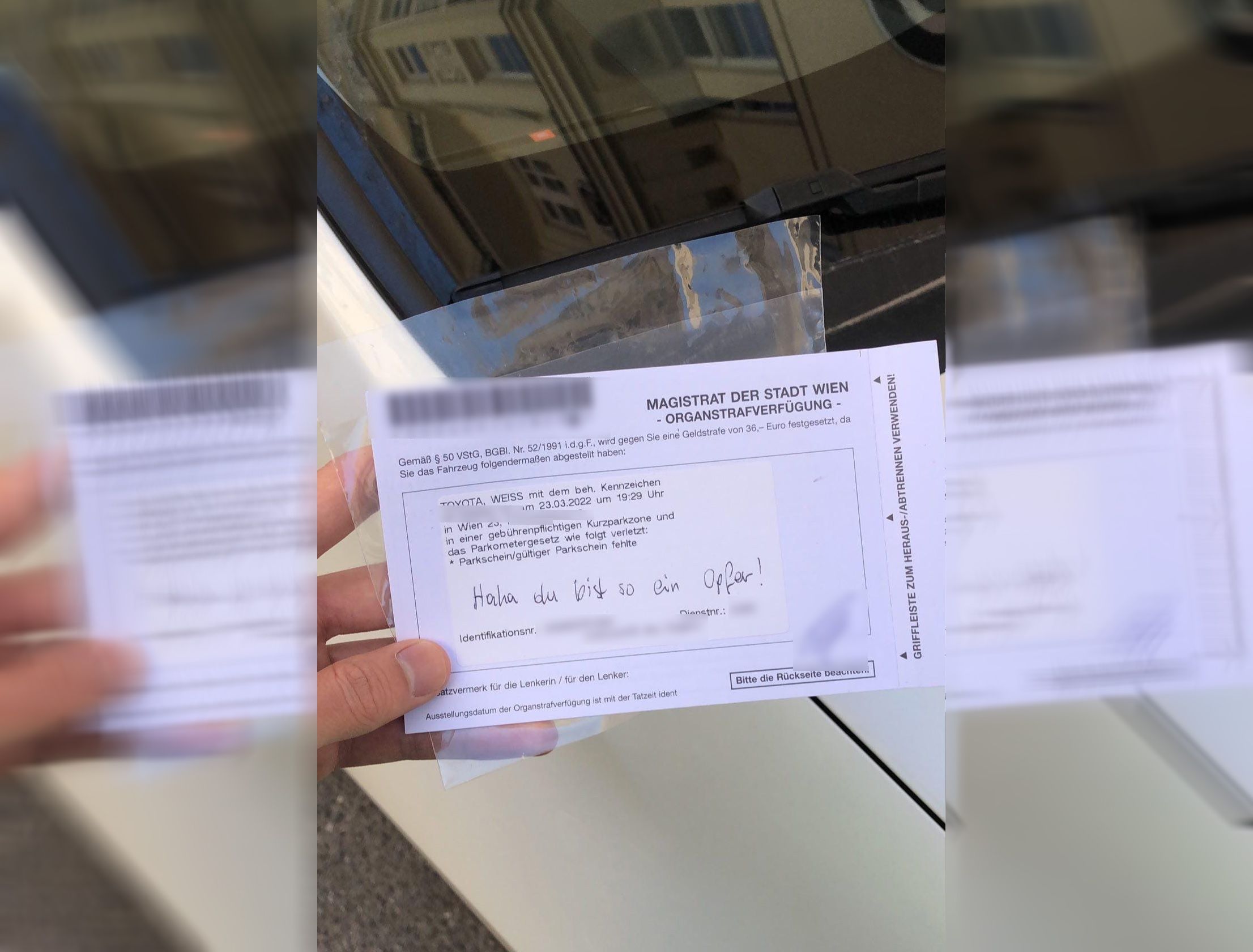 "Heute"-Leser Patrick* (Name von der "Heute"-Redaktion geändert) spazierte am Mittwochnachmittag durch den 23. Wiener Bezirk. Auf dem Weg zurück zu seinem Wagen fand er den Albtraum eines jeden Autofahrers auf seinem Fahrzeug vor: einen Strafzettel. Der Wiener schäumte aber nicht nur wegen der Parkstrafe in Höhe von 36 Euro, denn: Auf seiner Strafverfügung schrieb ein Unbekannter mit einem Kugelschreiber eine Nachricht dazu. In dieser steckte eine volle Ladung Schadenfreude über die erhaltene Strafe.