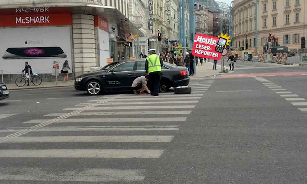 Mitten am Getreidemarkt hat am Sonntag ein Audi-Lenker aus der Tschechischen Republik einen Reifen verloren. An einer verkehrstechnisch äußerst ungünstigen Position. Zu allem Unglück funktionierte sein Wagenheber nicht richtig, was dem Mann zur Verzweiflung brachte.