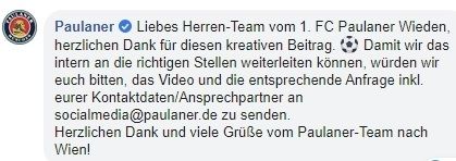Ob es dazu kommen wird, ist fraglich. Immerhin: Die Social Media Abteilung der Brauerei hat das Video bereits kommentiert. In der Antwort werden die Kicker ersucht Kontaktdaten an das Unternehmen weiterzuleiten. Danach könnte das Anliegen "an die richtigen Stellen" weitergeleitet werden.