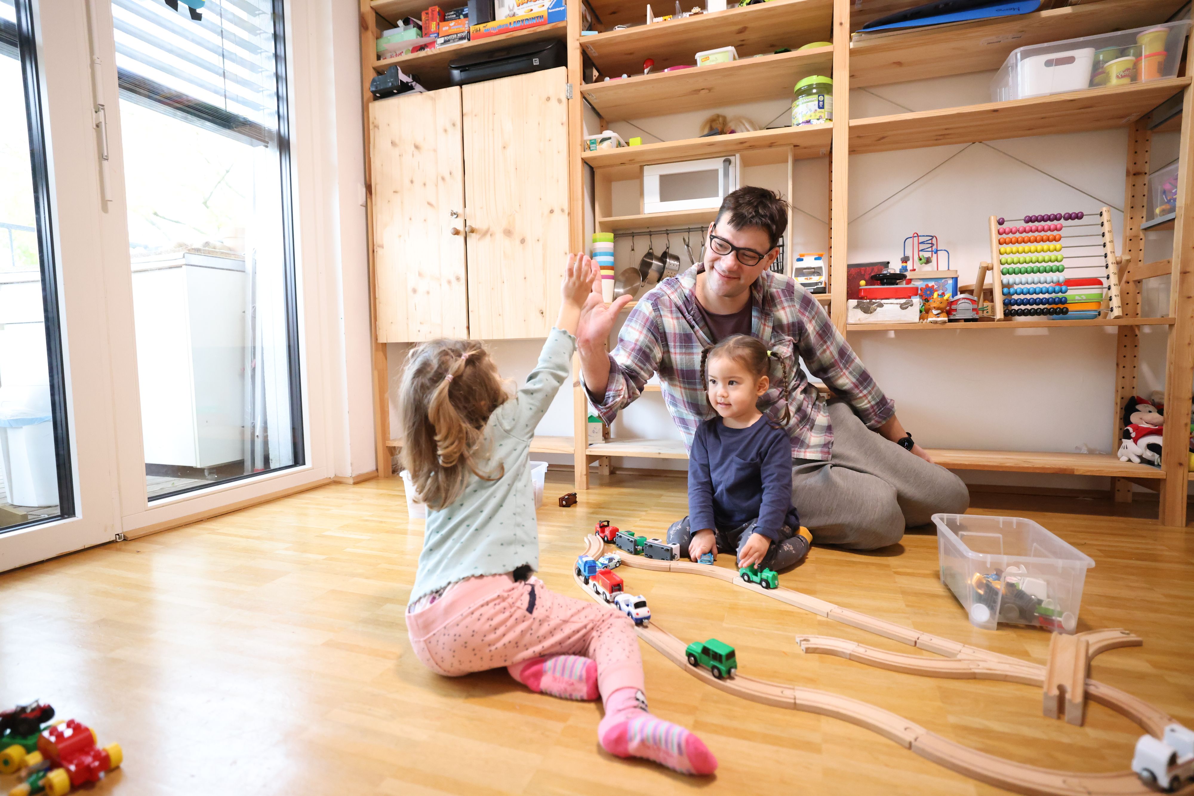 Heute, vier Jahre später, hat der 37-jährige seinen Traumberuf gefunden. Täglich betreut er rund fünf Kinder – darunter seine eigene Tochter Tamako – im Alter von einem bis drei Jahren. Seine Wohnungstür offnet Koszorus um 8 Uhr, um 16 Uhr werden die Kids wieder abgeholt. Dazwischen gibt es genug zu tun: "Morgens machen wir gemeinsam Frühstück, bevor sie erst einmal frei spielen", erzählt er von seinem Tagesablauf. Danach wird gemalt, gesungen, gelesen und geübt. Besonderen Wert legt der Tagesvater dabei auf Fein- und Grobmotorik. "Ich habe einen eigenen Raum dafür eingerichtet, das Thema ist sehr wichtig für die Entwicklung des Kindes!"