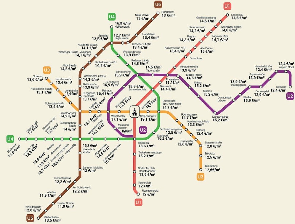 U-Bahnnähe ist eines der Top-Kriterien bei der Wohnungssuche. Die Wiener Firma zoomsquare erarbeitete jetzt einen Netzplan, der die Quadratmeterpreise in der Nähe aller Stationen anzeigt!