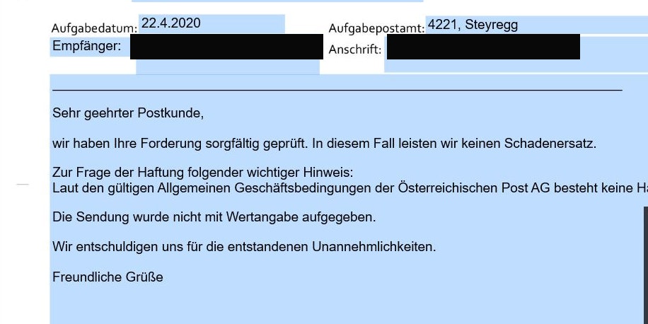 Schließlich erreichte das Schreiben dann doch die zuständige Poststelle, doch über deren Antwort staunte Ledochowski nicht schlecht: "Wir haben ihre Forderung sorgfältig geprüft. In diesem Fall leisten wir keinen Schadenersatz. [...] Die Sendung wurde nicht mit Wertangabe aufgegeben."