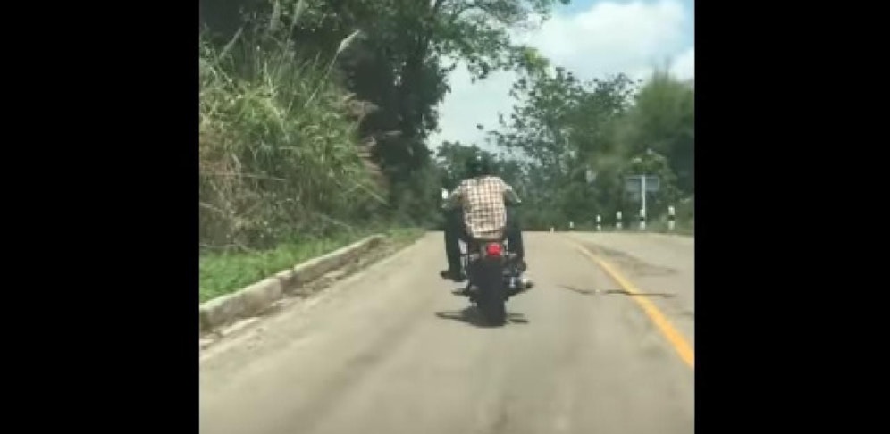 Als der Biker auf einer wundervollen Landstraße in Lampang (Thailand) seine Ausfahrt genoss, versuchte ihn, wie aus dem Nichts, eine Schlange zu beißen.