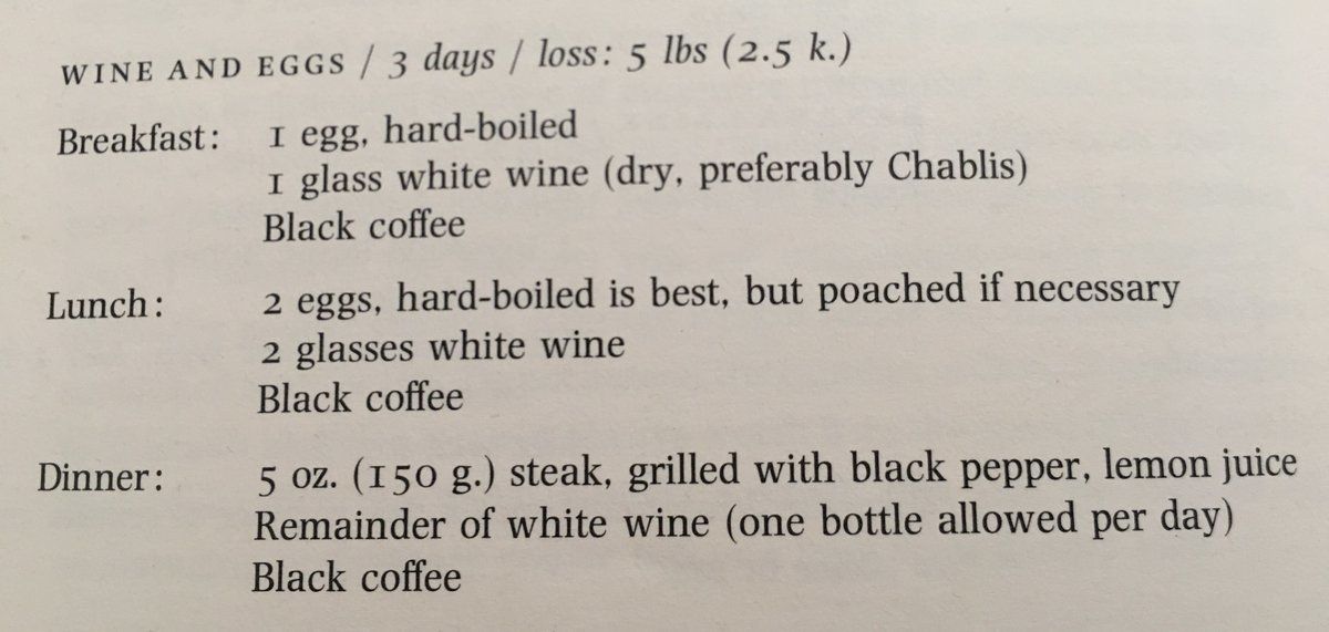 Im 1977 veröffentlichen "Vogue Body and Beauty Book" wird empfohlen am Tag eine ganze Flasche Weißwein zu trinken, dazu gibt es hartgekochte Eier und jede Menge schwarzen Kaffee. Erst am Abend ist ein kleines Steak erlaubt. Mehr aber auch nicht. Das Ziel: Innerhalb von drei Tagen 2,5 Kilogramm zu verlieren (und den klaren Blick, die Muttersprache sowie den sicheren Gang wohl gleich dazu).